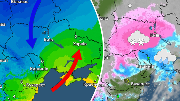 Зліва: опади в Україні. Справа: циклони над Атлантикою.