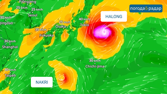 Дві сильні тропічні бурі вирують у західній частині Тихого океану. Потужний тайфун HALONG знаходиться на схід від Японії. З вітрами, швидкість яких перевищує 200 км/год, він продовжує рухатися в бік моря.