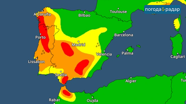 Для більшої частини Португалії та Іспанії оголошено штормове попередження про сильні дощі.