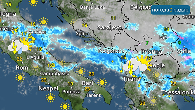 Сьогодні зона з сильними зливами та грозами переміститься далі на південь та в центральну частину Італії. Це також стосується Албанії та Болгарії. Ризик негоди не є особливо високим. Проте можливі окремі несподіванки.