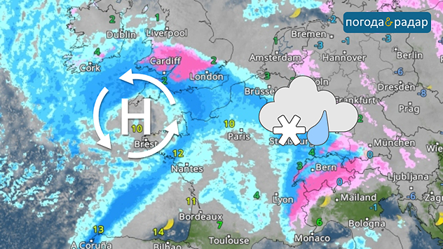 Метеорологічний радар: з Атлантики до Центральної Європи насувається область низького тиску.