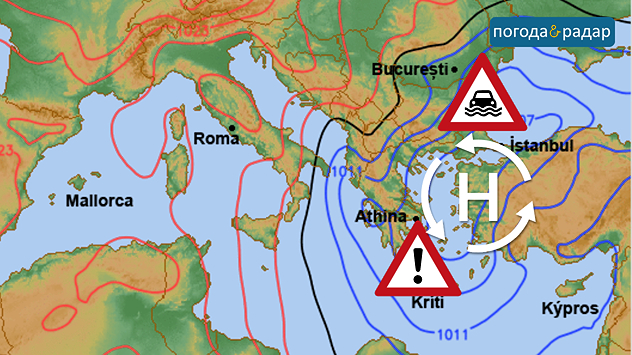 Низький тиск над Егейським морем та Малою Азією призводить до нестабільної погоди з ризиком повеней.