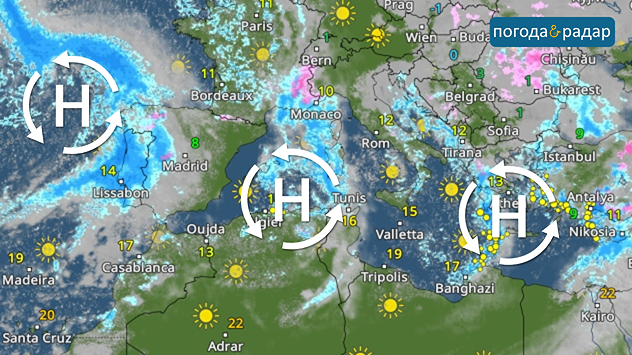 Радар Погоди: навколо Середземного моря одночасно діють кілька областей низького тиску.