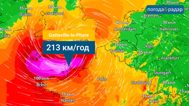 Радар Вітру: GORETTI досяг у Ла-Манші сили урагану. Біля маяка в Гаттвіль-ле-Фаре було зафіксовано порив вітру зі швидкістю 213 км/год.
